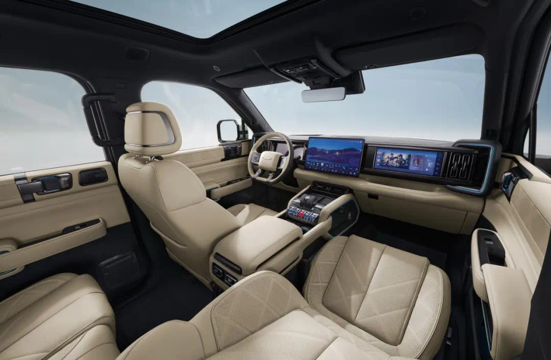 一起,非承载式车身、三把差速锁、低速四驱及蠕行形式等专业越野装备一应俱全,保证车辆在面临极点路况时,也能如履平地,尽显专业越野本性。智能座舱方面,支撑四区域语音唤醒、面部辨认以及多设备互联,让驾乘人员与车辆的交互愈加天然流通。高配车型装备的 12.3 英寸副驾文娱屏,为副驾驭乘客带来专属的文娱享用。生成式 AI 技能的融入,更是极大提升了交互的流通度与场景适应性。