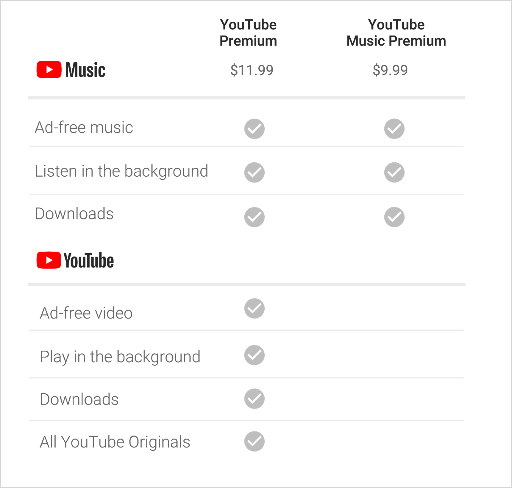 YouTube Music 原本是该公司的视频订阅服务 YouTube Red 的一部分。假如花费 11.99 美元的月订阅费用的话,用户将一起取得 YouTube Red 和 YouTube Music 服务。与此一起,YouTube Red 更名为 YouTube Premium,它一起包括音乐和视频内容。