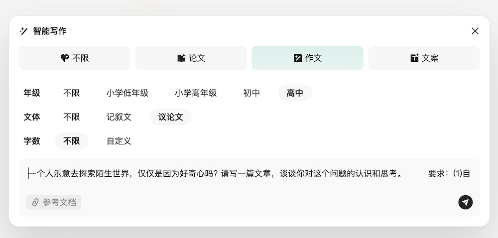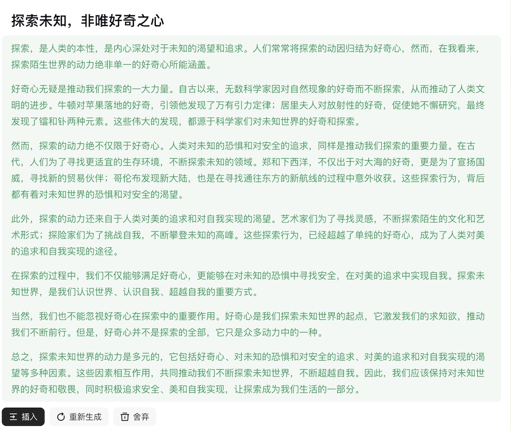 ima 的智能写作现在首要支撑论文、作文与案牍三大板块。咱们让 ima 写一篇高考作文与营销案牍,成果如下,它的体现还不错。