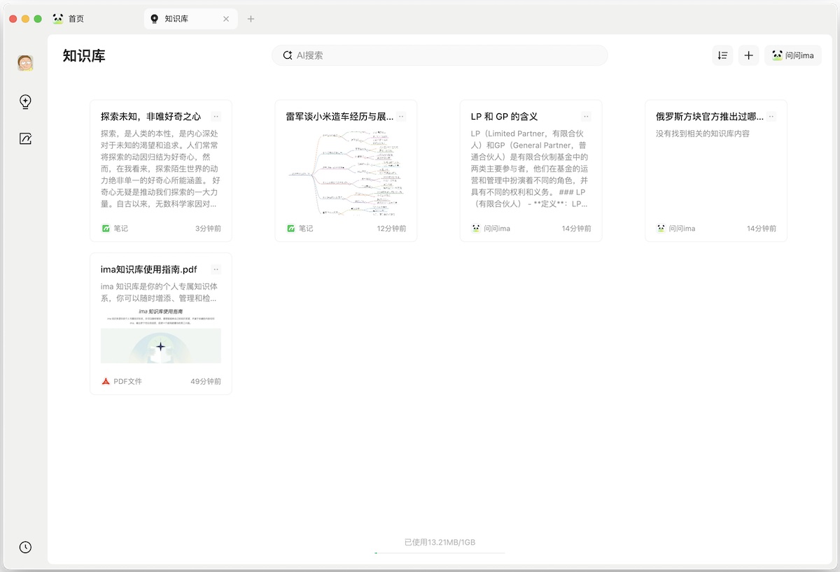 ima 的常识库功用也让人眼前一亮,基本上你能够把一切 AI 问答成果、文档解读成果、脑图、创造的案牍等内容悉数保存至笔记或常识库中,打造自己的专属材料库,日后想查找的话能够从已有内容中检索,十分高效。