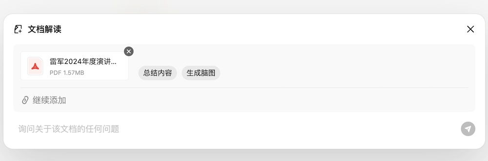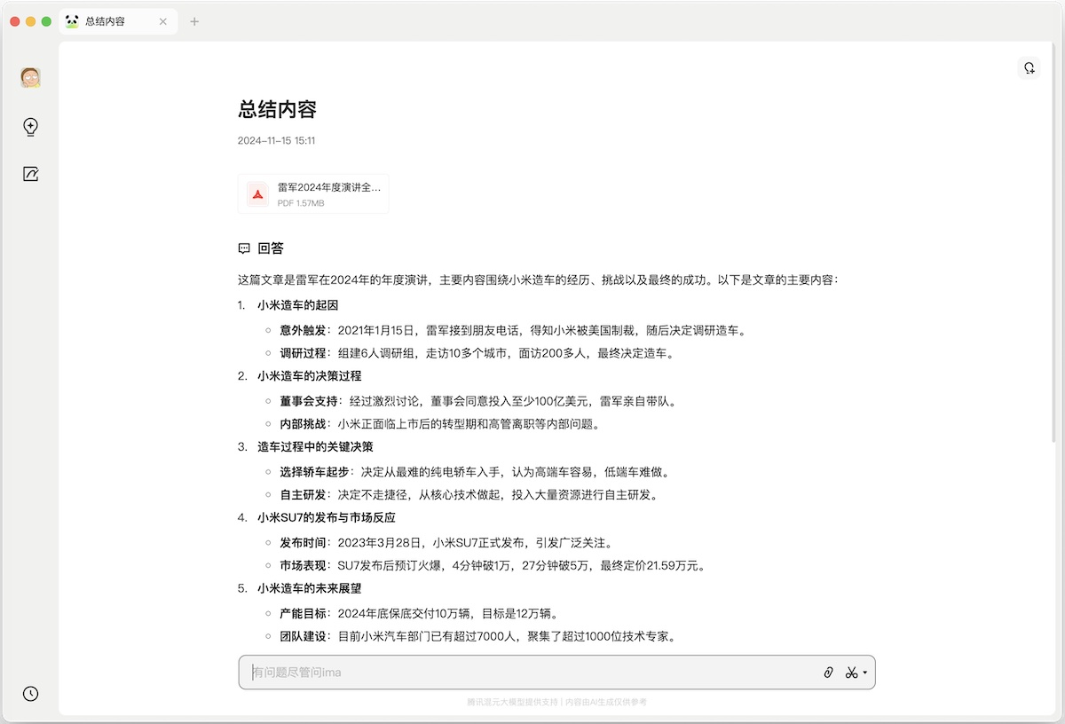 咱们尝试用 PDF 文档《雷军 2024 年度讲演全文:勇气》让 ima 进行解读。解读效果整体令人满意,输出后还支撑进一步生成脑图,便使用户将其存入常识库或记笔记,堆集起来用作后续的学习、探究材料。