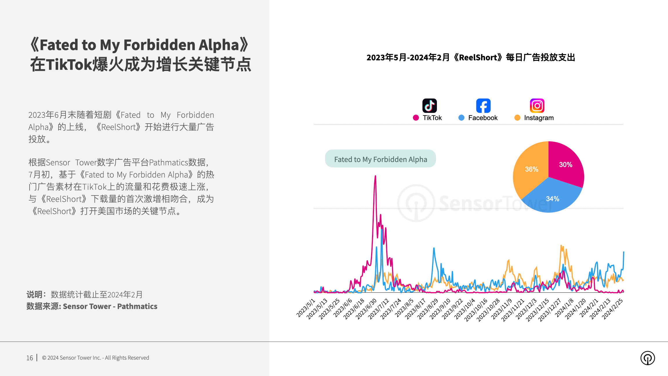 抢手短剧《Fated to My Forbidden Alpha》广告资料在TikTok渠道的爆火成为《ReelShort》增加要害节点。依据Sensor Tower数字广告渠道Pathmatics数据,2023年7月初《Fated to My Forbidden Alpha》广告资料在TikTok上的流量和花费急速上涨,与《ReelShort》下载量的初次激增相吻合,成为翻开美国商场的要害节点。