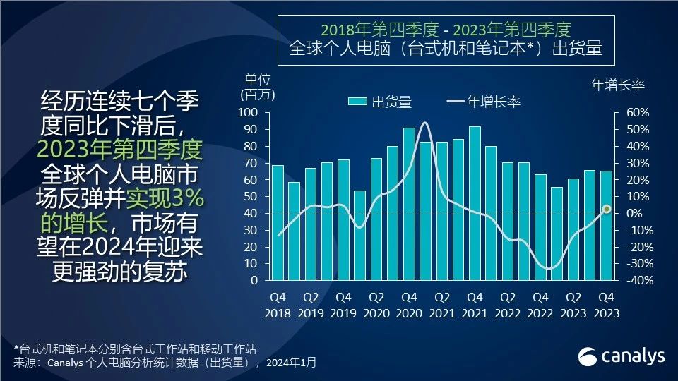 依据Canalys发布的陈述,2023年第四季度,全球个人电脑(PC)商场出货量同比增加3%,完毕了接连七个季度的同比下滑。第四季度台式机和笔记本的总出货量增至6530万台。笔记本电脑出货5160万台,比2022年增加4%;而台式机的出货量为1370万台,较上年略降1%。2023年全年,个人电脑出货量总数为2.47亿台,较2022年下降13%。目前商场增加蓄势待发,AI PC将在接下来的电脑更新周期及之后供给额定动力。